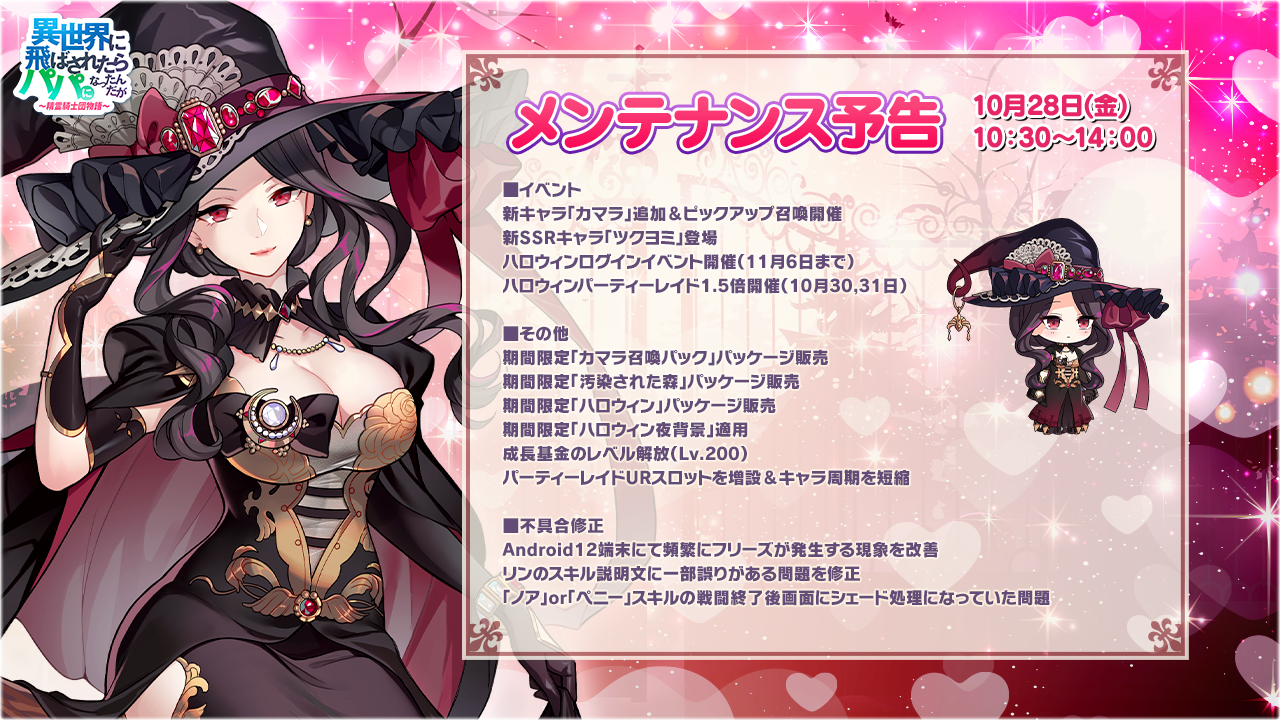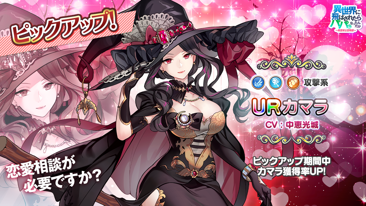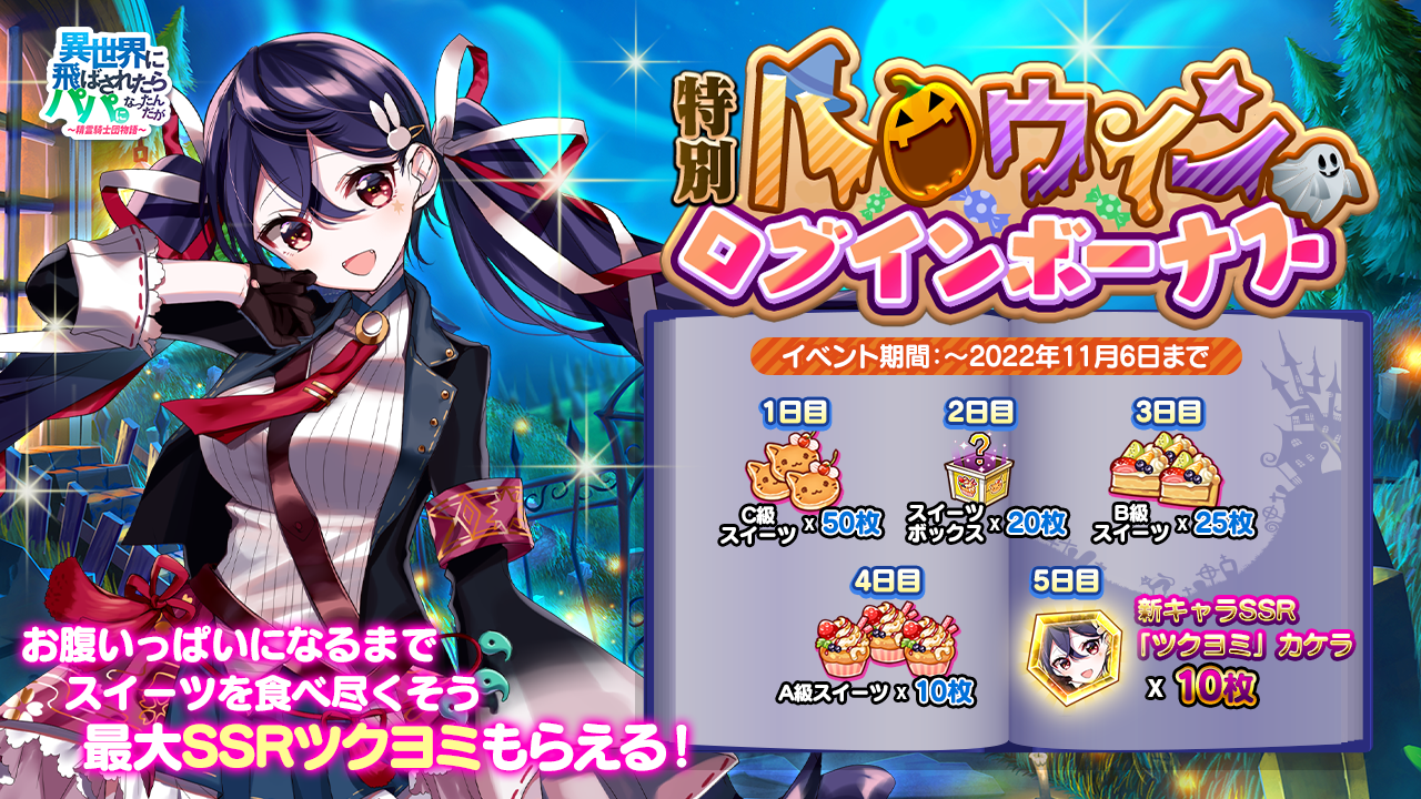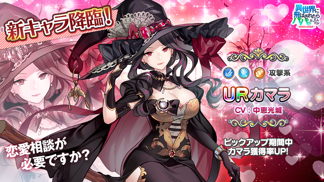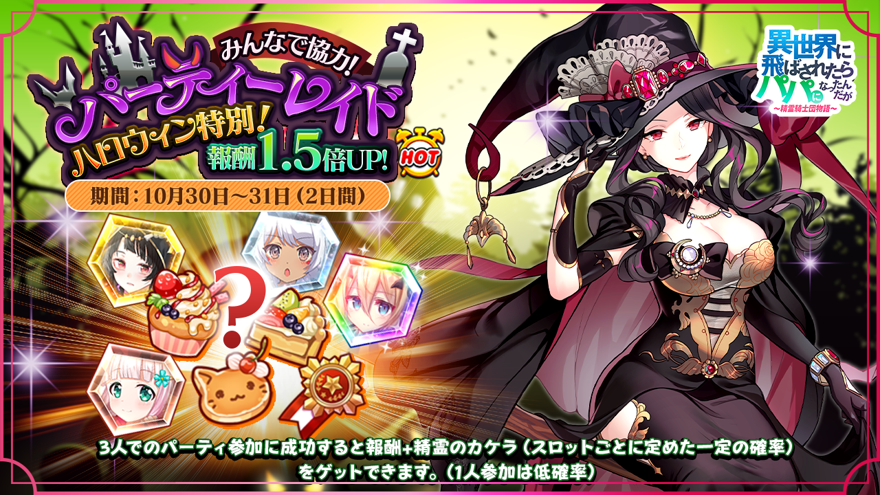 『異世界のパパ』スキル強化に必要なスイーツを食べ尽くそう「ハロウィンパーティー」開催!ハロウィン魔女「カマラ」登場や新機能セレクト召喚/待望のパーティーレイドURスロット増設も実施!