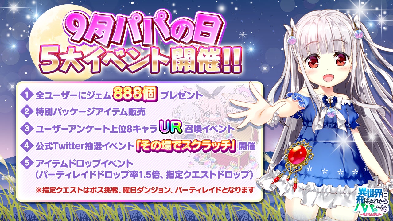 『異世界のパパ』9月もパパの日5大イベント開催!恒例のジェムプレゼント/限定パッケージ/UR召喚ガチャ/ドロップイベント/スクラッチイベント/ログインイベント!